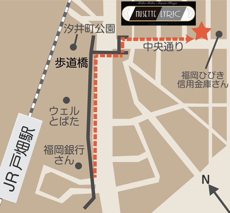 ①改札口〜左手に進み②福岡銀行戸畑支店前「戸畑駅」より乗る→②バス(2、5、7M、25、40 ) →③ 「浅生市場前」で降り(1駅・2分)→④直進し 福岡ひびき信用金庫浅生支店 手前の→